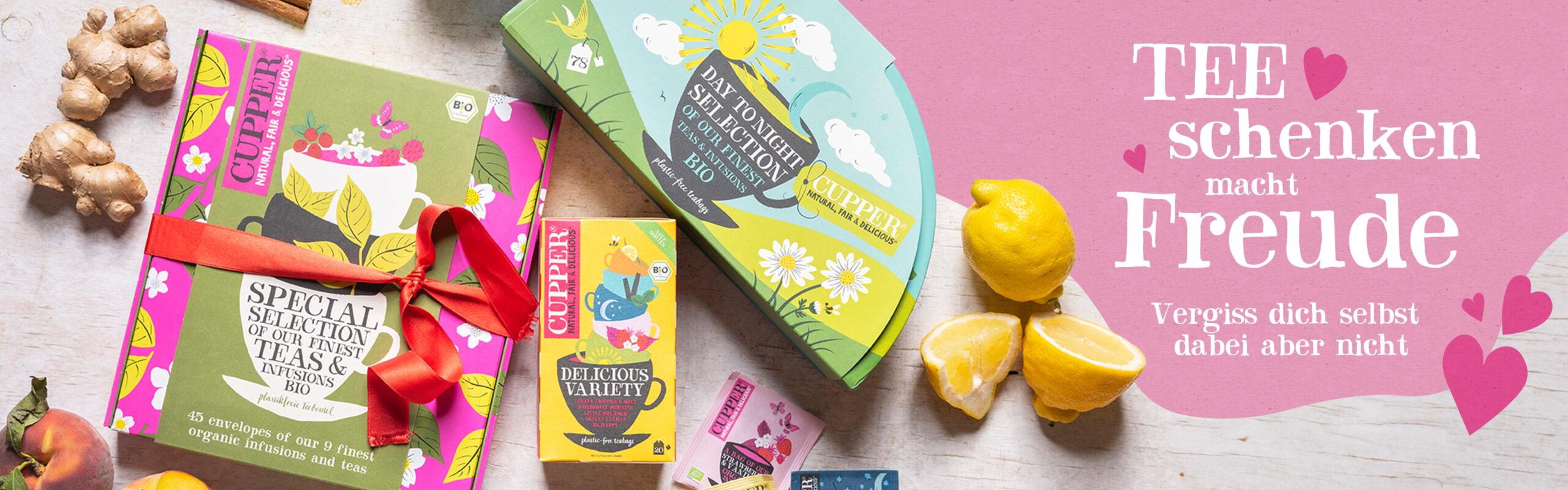 Die Besonderheit der Kräuter-, Gewürz- und Früchtetees von CUPPER liegt, neben der Bio-Qualität aller Zutaten, in deren Kombination. Jeder einzelner unserer Bio-Tees sorgt durch raffinierte, aber harmonische Zutaten für einen außergewöhnlichen Geschmacksmoment. Für unseren Tee „Lovely Liquorice & Mint“ zum Beispiel vereinen wir die Süße natürlicher Süßholzwurzel mit erfrischender grüner Minze zu einem einzigartigen, vollmundigen Geschmack. „Love Me Truly“ hingegen ist ein wohltuender und wärmender Chai-Gewürztee. Und in „Fresh Glow“ verbinden sich fruchtiger Apfel, würziger Ingwer und elegantes Zitronengras zu einem Früchtetee mit besonderem Kick.